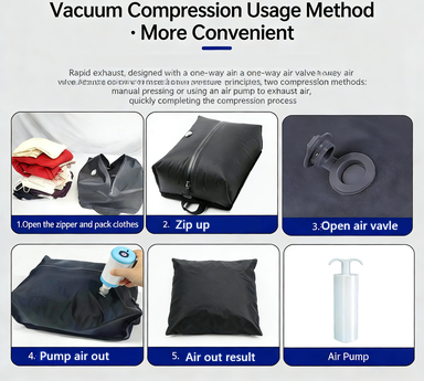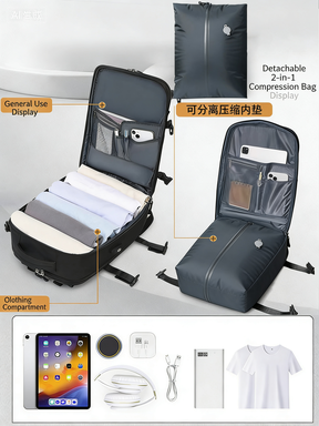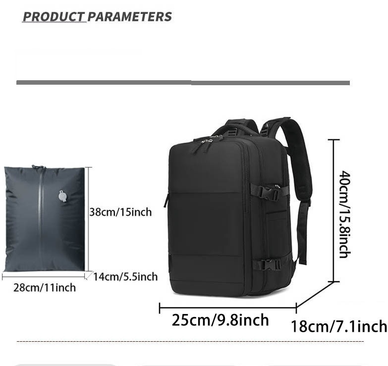 - 【Vacuum Compression Bag and Air Pump】 There is a vacuum compression bag inside the largest compartment of the backpack, can be used separately, you can put the clothes into the vacuum bag, tighten the zipper, open the one-way exhaust valve, and use the air pump for vacuum compression to reduce the volume of the items occupying the volume, and load more things. Please note that the zipper used in the vacuum bag requires more force to pull, this is to ensure that the vacuum airtight, not the zipper damage is not smooth.